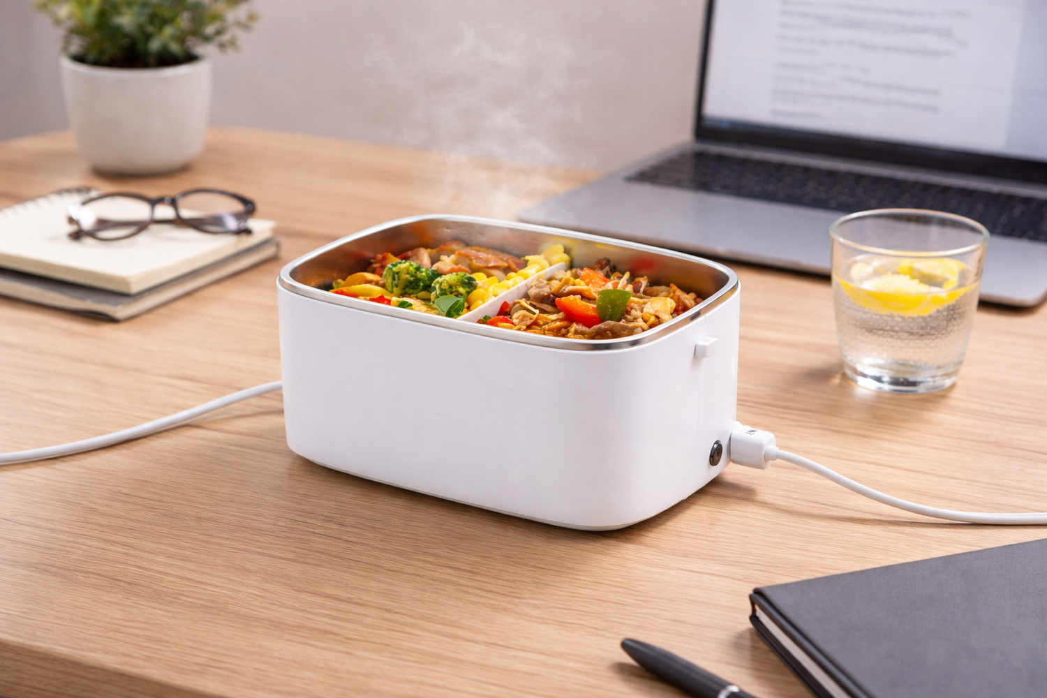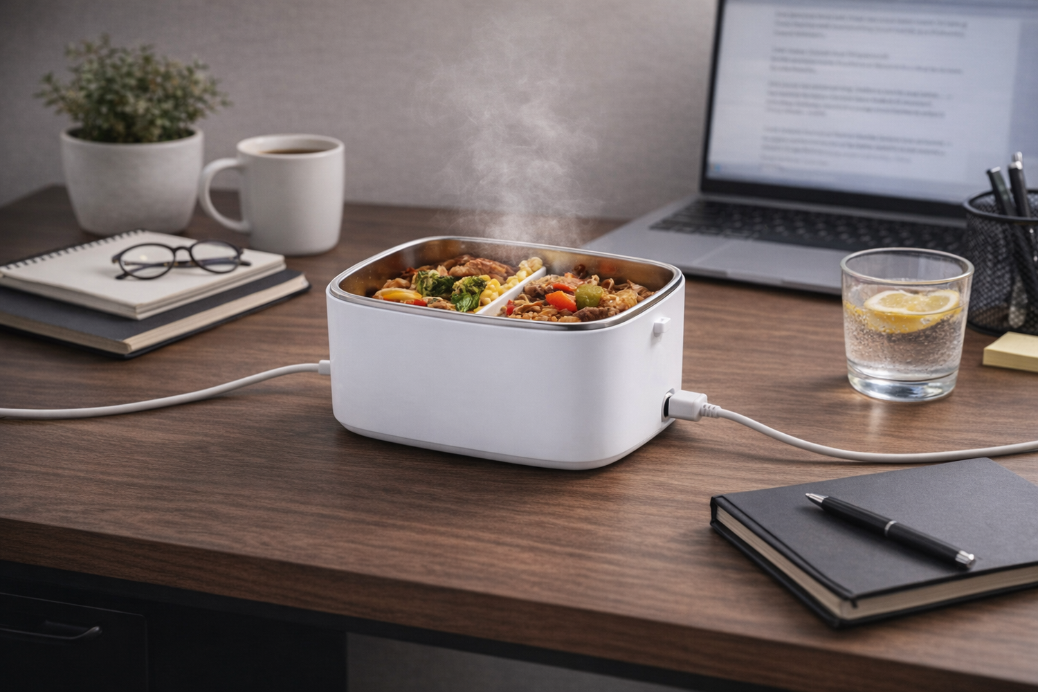 Plug it in about 15–20 minutes before you eat. Your meal warms gradually and evenly — without leaving your workspace or relying on shared office microwaves.